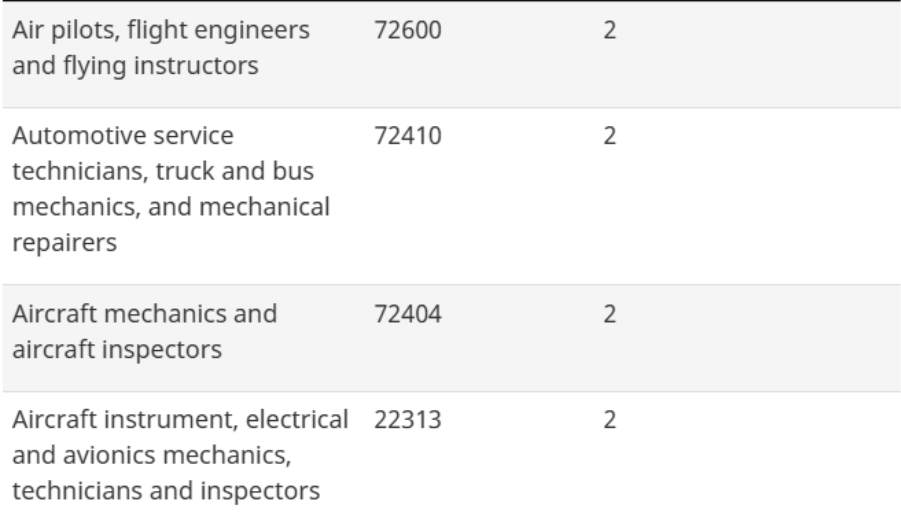 Categ. 2: Transport occupations com experiência profissional em ocupações na área de transportes, incluindo pilotos, mecânicos de aeronaves e inspetores.