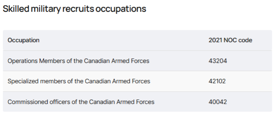 Confira os NOCs selecionado para a categoria Foreign Military, onde candidatos militares estrangeiros altamente qualificados são recrutados pelas Forças Armadas Canadenses para funções-chave, como médicos militares, enfermeiros e pilotos.